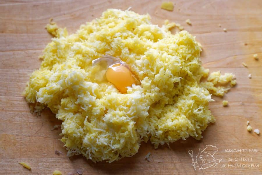 Do prolisovaných brambor si uděláme důlek, do kterého si rozklepneme vajíčko a vsypeme trošku hrubé mouky a dětské krupičky. Dlaněmi vypracováváme kompaktní, ale příjemně měkké těsto. Postupně přidáme všechnu mouku, krupičku a také špetku soli.