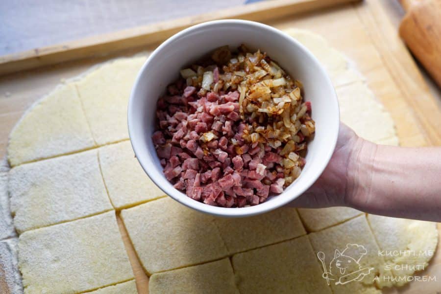Začneme přípravou uzeného masa, které bude potřeba nechat před samotným zpracováním do náplně povařit. Uzené maso uvaříme buď v celku alespoň 45 minut, ale klidně 2 hodiny za mírného bublání. Poté ho nakrájíme na drobné kostičky, nebo buďte jako naše rodina a rozemelte ho. Na trošce oleje si osmahneme na kostičky nakrájenou cibuli. Stačí, když bude jen lehce chycená zlatavou barvou a přidáme ji k uzenému masu. Směs do knedlíků je připravená a může zůstat bokem.