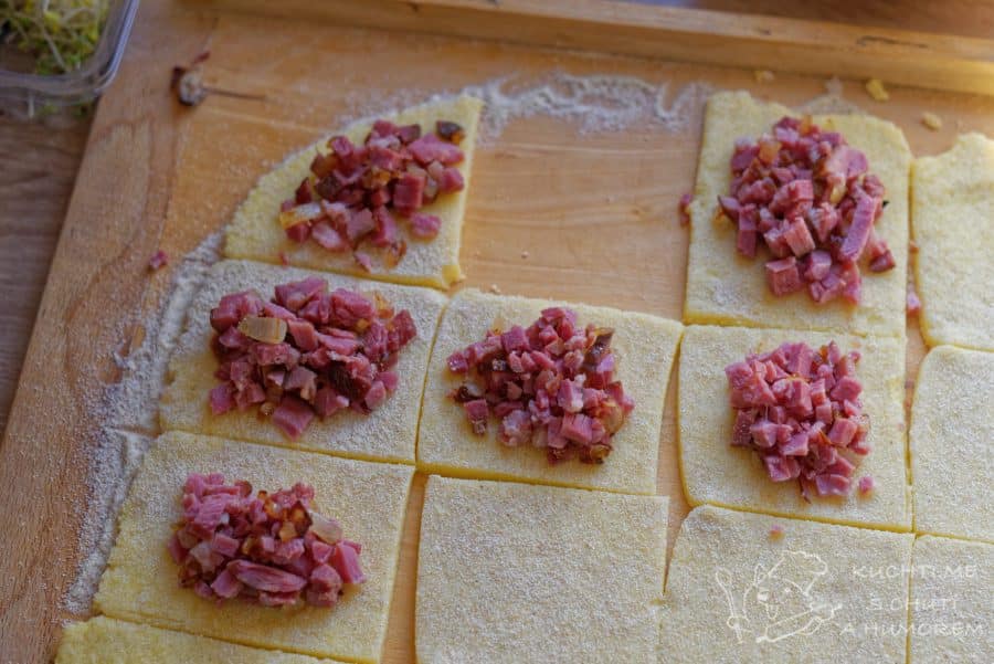 Bramborové těsto necháme na pomoučeném válu a rozválíme ho na plát asi 7 mm tenký. Rozdělíme ho na čtverce 10 x 10 cm a plníme směsí. Do každého knedlíku se vejde přibližně 1 vrchovatá polévková lžíce směsi.