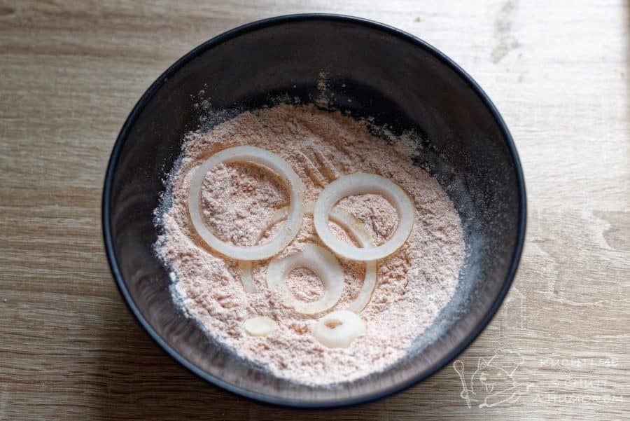V pánvi necháme rozehřát olej a jdeme obalovat. Plátky cibule jemně obalíme v mouce a trošce červené papriky a necháme na středním plameni smažit v oleji. Smažíme postupně, aby se cibule napřekrývala. Pak ji vyndáme a necháme okapat na papírové utěrce. Ještě ji lehce osolíme a můžeme servírovat.