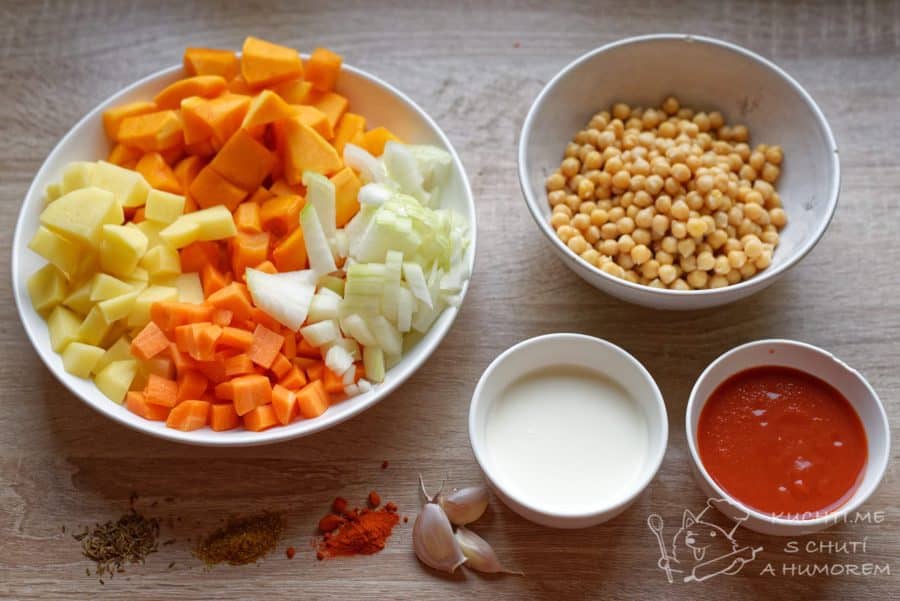 Další recepty z kategorií: Další recepty dle ingrediencí: brambory, červená paprika, česnek, cibule, cizrna, hokaido, kari, kysaná smetana, mrkev, olivový olej, rajský protlak, římský kmín, sůl, voda