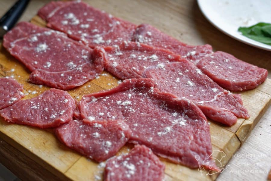 Telecí maso nakrájíme na cca 1 cm tenké plátky, které ještě lehce naklepeme. Osolíme je, opepříme a jednu stranu, na kterou nebudeme dávat prosciutto, ještě zaprášíme hladkou moukou.