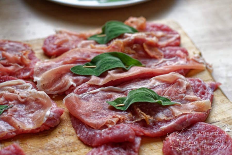 Na nepomoučenou stranu telecího položíme prosciutto a také plátek šalvěje. Sepneme párátkem a jdeme smažit.
