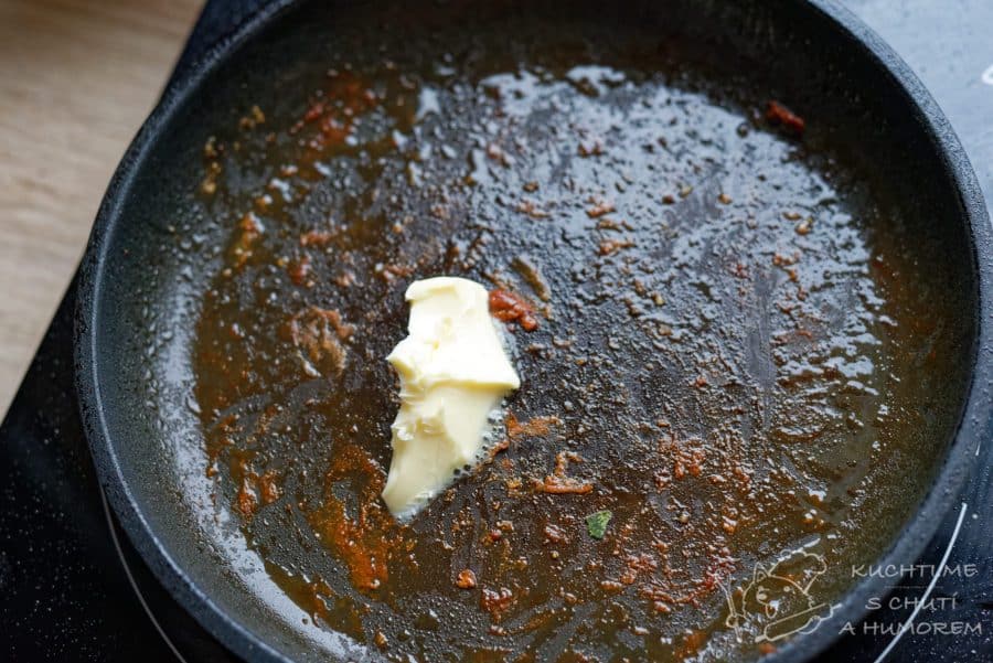 Do výpeku přidáme lžíci másla a necháme ji rozpustit. Podlijeme bílým vínem a vařečkou dobře promícháme, abychom ze dna pánve dostali co nejvíce výpeku. Poté ještě podlijeme vodou a necháme alespoň 5 minut vařit, aby se nám výpek zredukoval a vznikla lahodná omáčka.