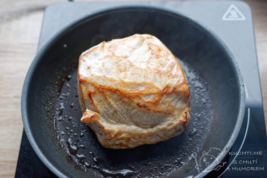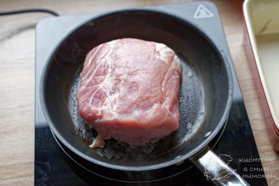 Maso vlastně nepotřebuje žádnou extra zvláštní péči. Stačí, když jej hezky v celku osmažíme ze všech stran na troše olivového oleje a přendáme do pekáčku a ještě celé dobře osolíme.