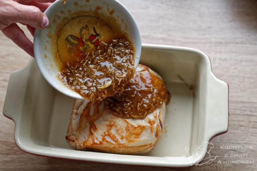 Po 1,5 hodině teplotu zvýšíme na 200 °C a necháme ještě půl hodiny péci. Maso klidně v průběhu můžeme obrátit. Marináda se nám v pekáčku krásně zredukuje na naprosto vynikající omáčku.