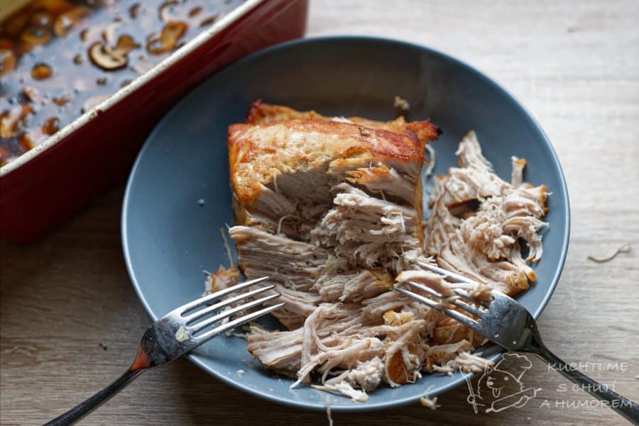 Když je maso upečené, tak ho nechte alespoň 5–10 minut odležet, aby povolilo a krásně se trhalo. Poté jej vidličkami natrháme přímo do výpeku a můžeme ho podávat.
