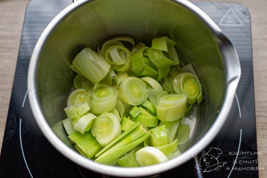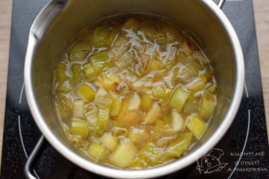 V pánvi dáme rozehřát olej, na kterém osmažíme pórek společně s jarní cibulkou do zezlátnutí. Poté k tomuto základu přidáme zbytek zeleniny, bobkový list a zalijeme vodou. Osolíme a můžeme nechat vařit přibližně 15 minut od bodu varu.