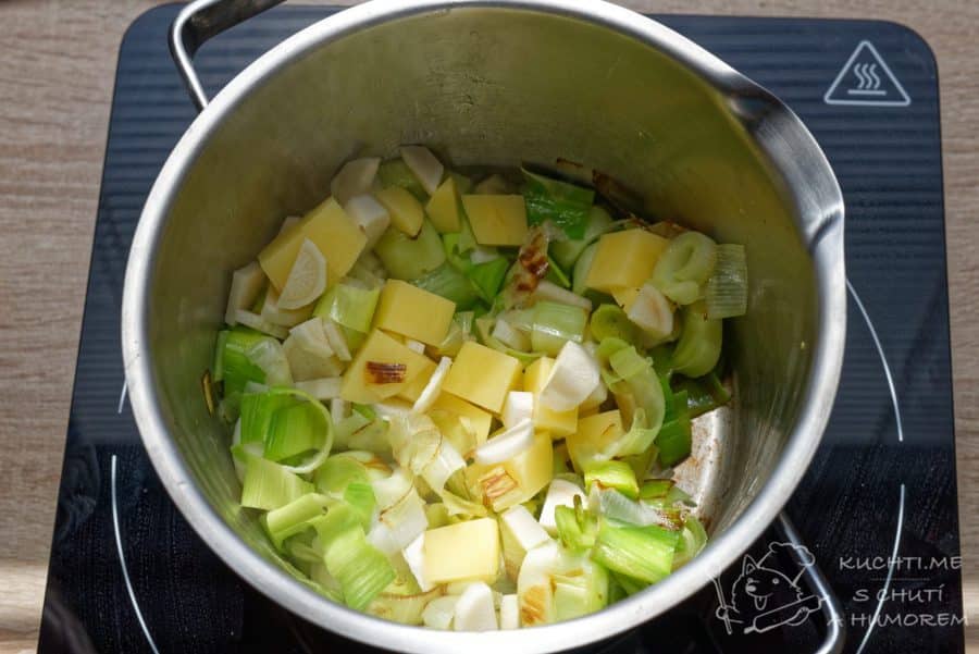 K ruce si tedy připravíme očištěný pórek a jarní cibulky, které nakrájíme na plátky. Brambory a petržel oloupeme a nakrájíme na kostičky.