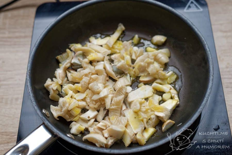 Využijeme sílu čerstvých hub. Ty očistíme a nakrájíme na cca 3 mm plátky. Budeme je smažit na troše olivového oleje a to pěkně na střední plamen do zetlátnutí. Dejte houbám čas a to klidně 20 minut. Jakmile budou krásně zlatavé a křupavé, osolíme je a máme hotovo.