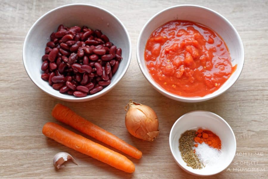 Další recepty z kategorií: Další recepty dle ingrediencí: bílé fazole, černé fazole, červená paprika, česnek, cibule, cukr, kmín, kysaná smetana, limetka, sekaná rajčata, sůl, tortilla, voda, vývar
