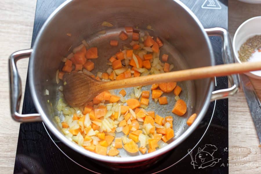 Cibuli a česnek oloupeme a nakrájíme na drobno. Do hrnce dáme rozehřát olivový olej, na kterém budeme nejprve restovat cibuli a to přibližně 5 minut, dokud nezměkne a nezesklovatí.
