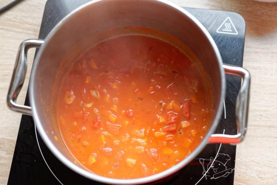 Do hrnce přidáme rajčata z plechovky a také vývar případně vodu. Osolíme a přidáme také trošku cukru, aby se nám zjemnila chuť rajčat.