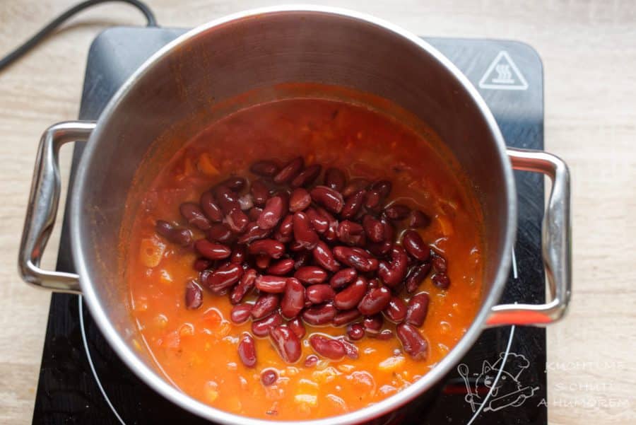 Poté přidáme také slité fazole a ještě je necháme chvilku prohřát. Stačí opravdu jen pár minut.