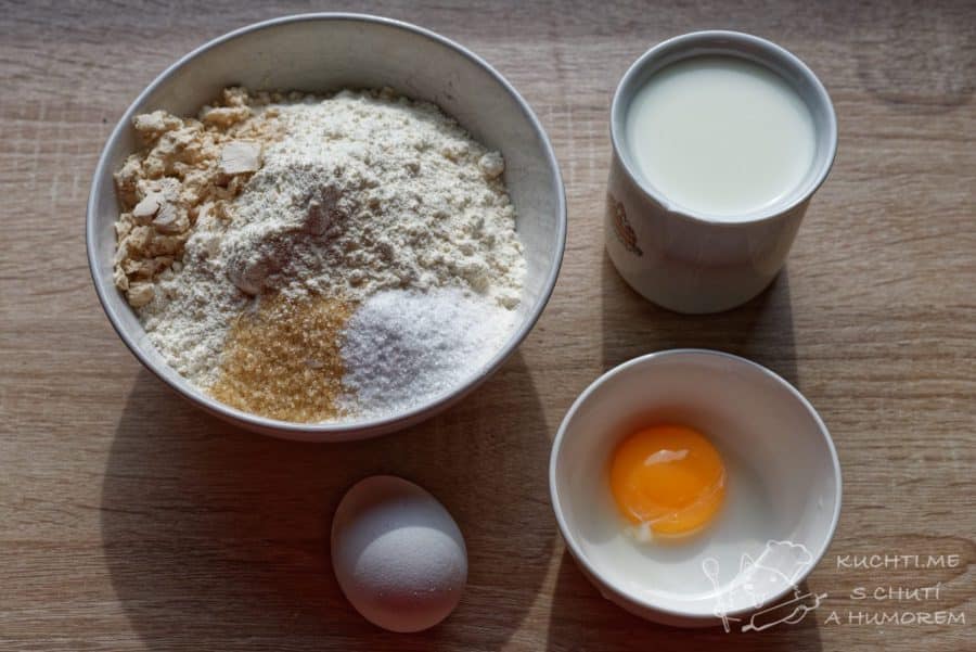 Do hrnečku dáme trošku mléka s cukrem a solí a přidáme rozdrobené droždí. Takto necháme chvilku vzejít a mezitím si připravíme zbytek ingrediencí.