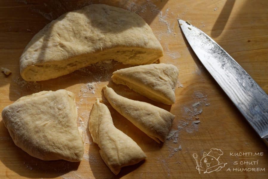 Těsto nám vykynulo, takže si ho přendáme na pomoučený vál. Prohněteme ho a vyženeme z něj bublinky. Válečkem z něj vyválíme kruh, ze kterého vykrojíme 12 trojúhelníčků.