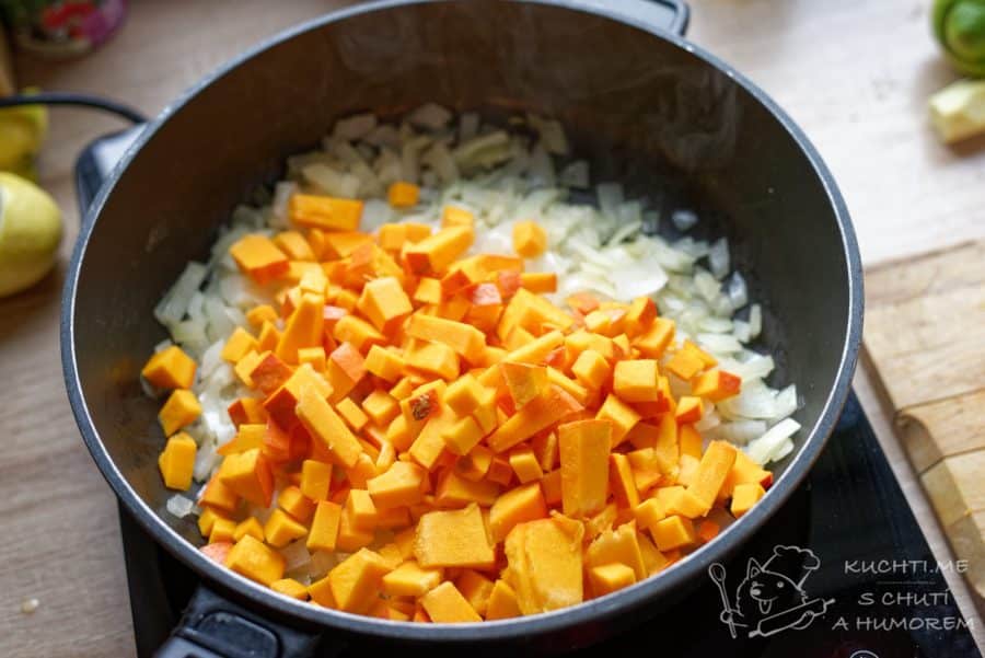 Omyjeme dýni hokaido a zbavíme ji semínek. Pak ji nakrájíme na drobné kostičky.