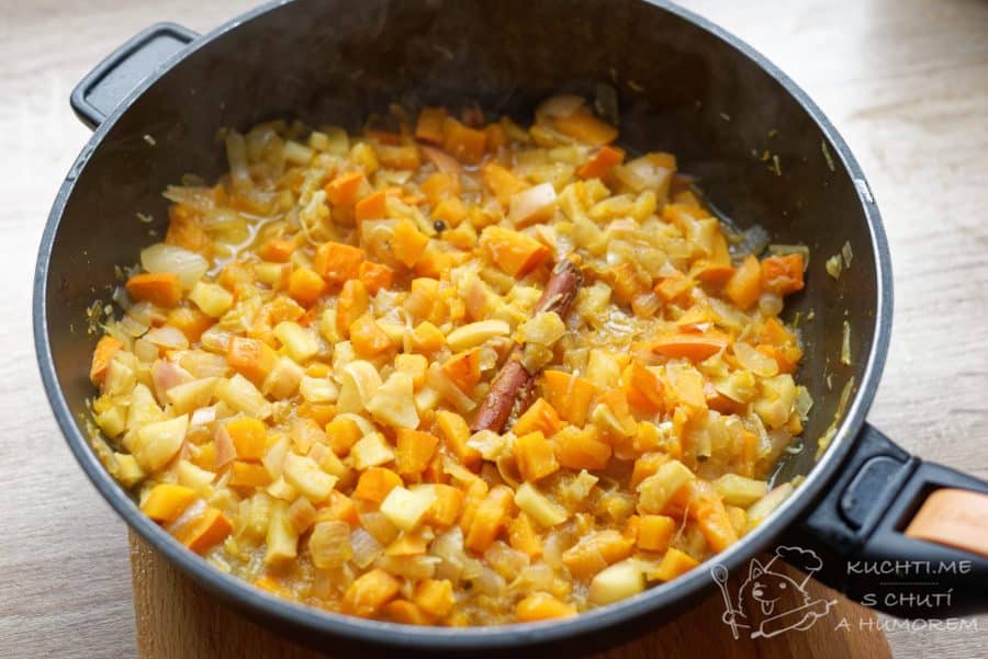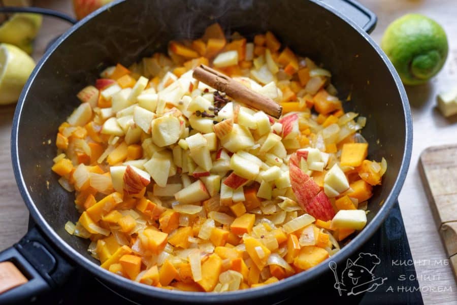 Do velké pánve nebo do hrnce dáme rozpálit trošku olivového oleje, na kterém budeme smažit hokaido, jablka a cibuli. Pěkně na středním plameni a dokud nám vše nepovolí a nezačne lehce hnědnout.