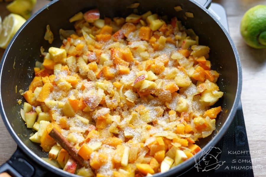 Do pánve přidáme také cukr a sůl a necháme cukr lehce zkaramelizovat. Celou směs mícháme, aby se nám nepřípálila a cukr se rovnoměrně rozpustil. Dáme tomu cca 5 minut. Nezapomeňte přidat také nastrouhaný zázvor, který dodá celému čatní šmrnc.