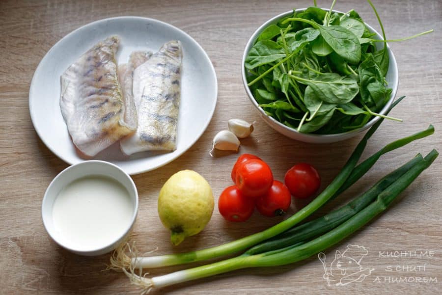 Ingredience na rybu ve smetanové omáčce s rajčaty a špenátem