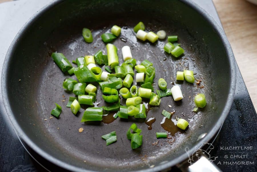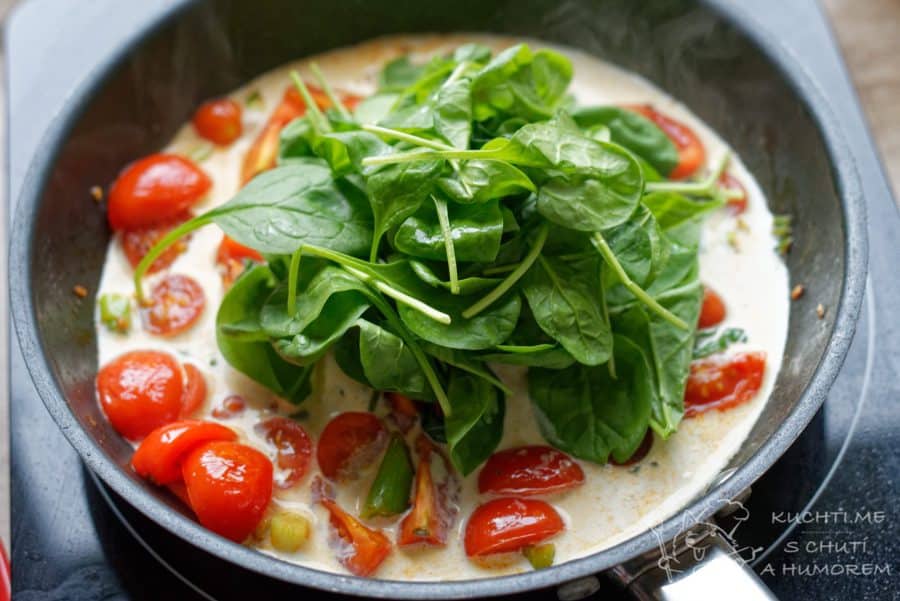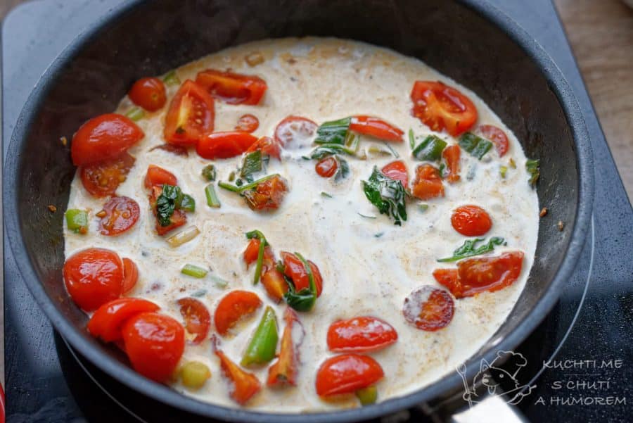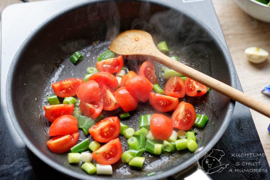Do pánve přidáme jarní cibulku a budeme ji přibližně 2–3 minuty restovat. Poté k ní přidáme také rajčata a opět je necháme pár minut povolit. A teď už jen smetanu, kterou necháme přivést k varu. Lehce osolíme, přidáme česnek a nakonec ještě necháme zavadnout špenát.