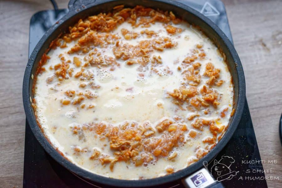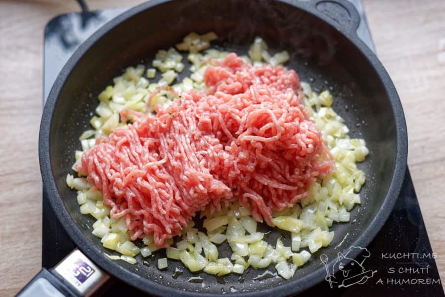 Přidáme mleté maso a vařečkou ho rozdrolíme na menší kousky. Teď už klidně přidáme na výkonu, aby se maso restovalo. Jakmile bude lehce nahnědlé, tak ho osolíme.