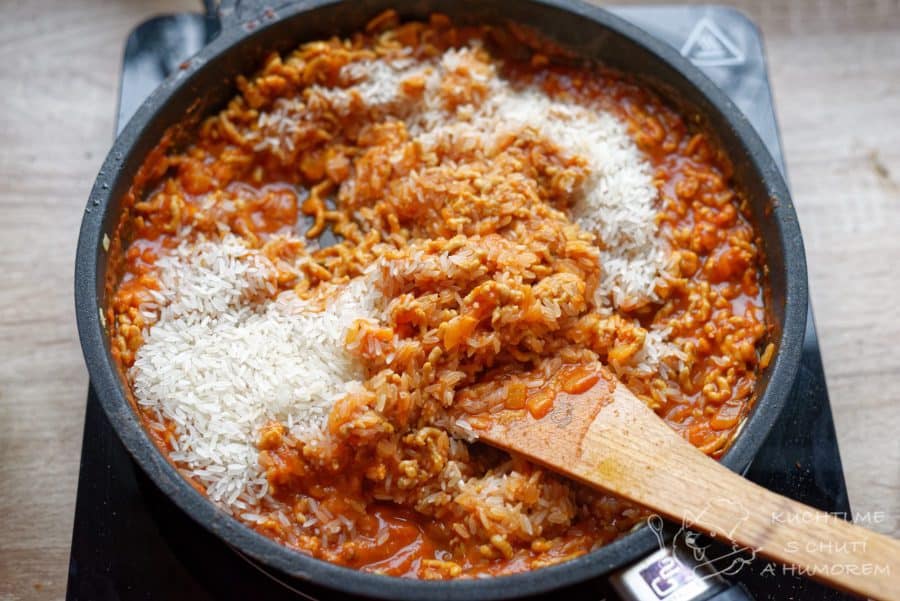 V jiné misce smícháme vejce společně s nastrouhaným sýrem a poté vše promícháme s rýží a masem a přendáme do zapékací mísy. Směs lehce přitlačíme a necháme péct.