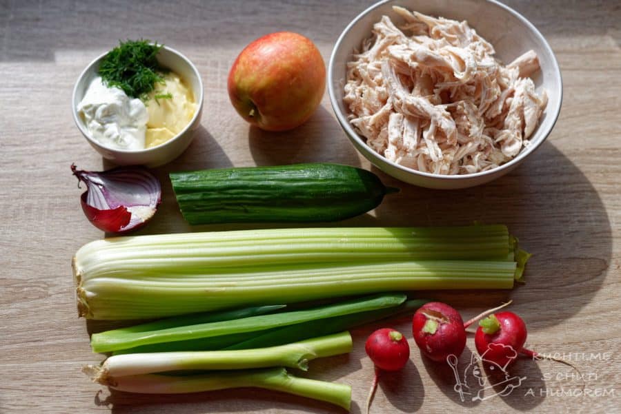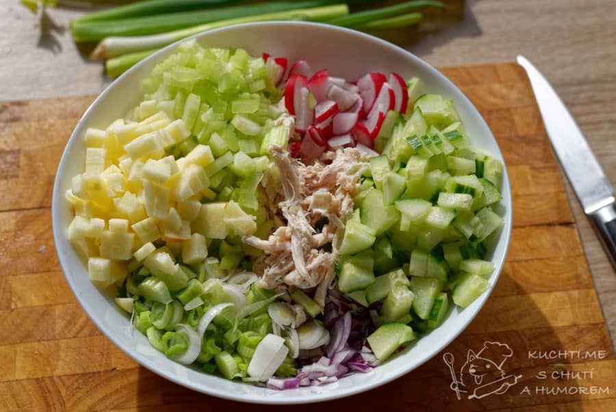 Další recepty z kategorií: Další recepty dle ingrediencí: bílý jogurt, chleba, cibule, citronová šťáva, jablka, jarní cibulka, kopr, kuřecí prsa, majonéza, okurka, pepř, řapíkatý celer, ředkvičky