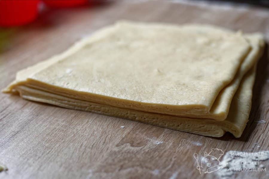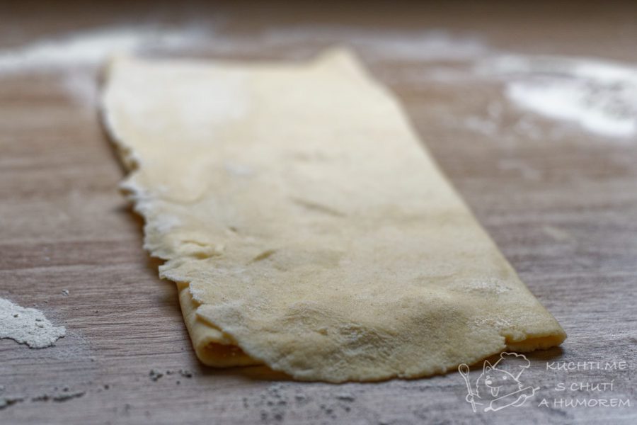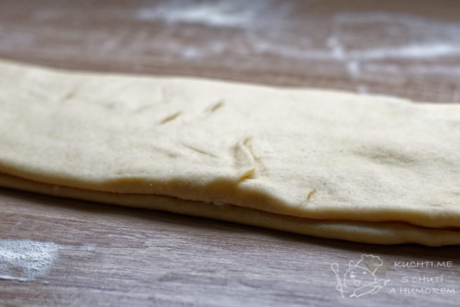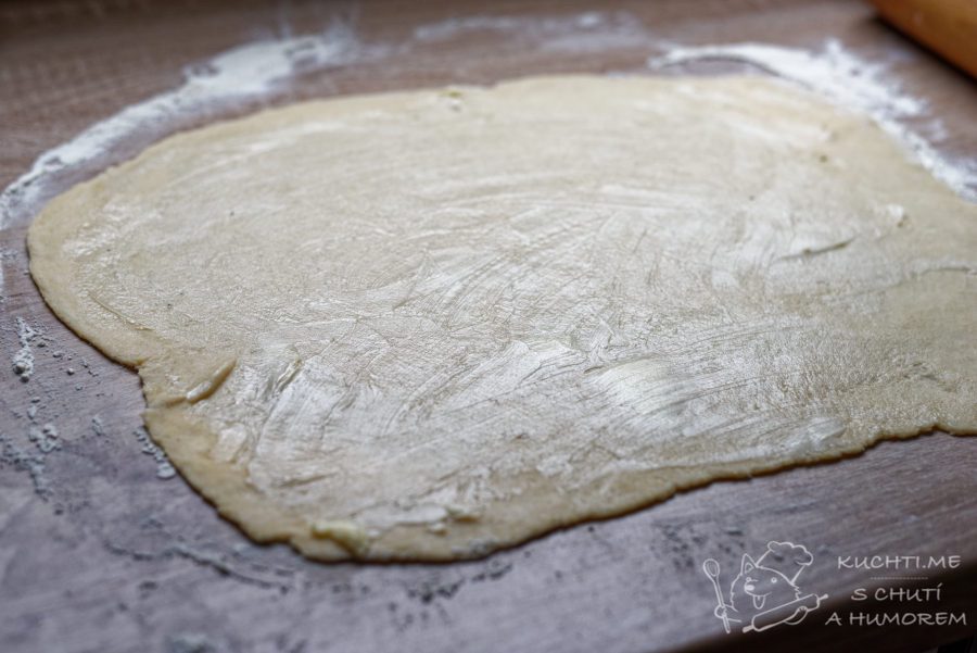 Těsto rozdělte na dva díly. Vál si pomoučíme a každý díl vyválíme na co nejtenčí obdélník, asi 1–2 mm silný. Oba díly mají mít přibližně stejný rozměr. Pokud se to nepovede, vůbec nevadí – jak říká Verča (spoluautorka Bichlí): „pr…l si to přebere.“ Pláty potřeme rozpuštěným máslem.