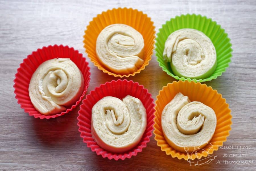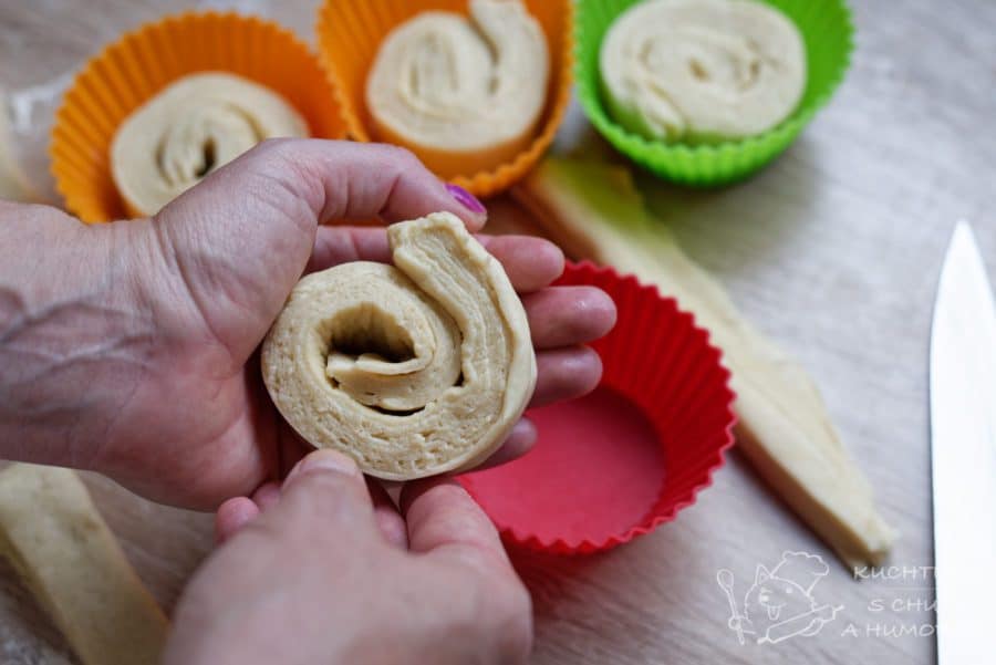 Nožem nakrájíme 2–3 cm široké proužky, ze kterých budeme rolovat ruličky, které potom vložíme do formiček na muffiny.