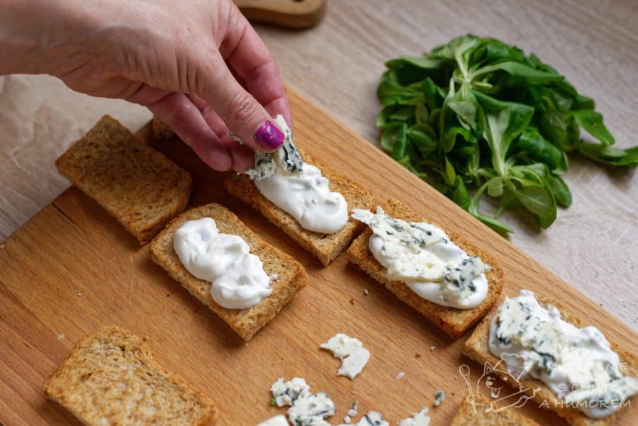 Na namazané plátky rozložíme plátky hrušky a také na tenké plátky nakrájený modrý sýr – výborná je niva, skvěle se hodí také gorgonzola.